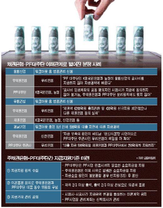 문제는 워크아웃 기업에 대한 이같은 채권은행과 PF대주단의 다른 이해관계를 조율하고 역할분담을 위한 명확한 기준이 없다는 것이다. 이 때문에 문제가 생기면 서로 제몫챙기기 행태가 반복된다는 지적이 나온다.