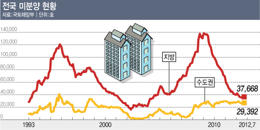 올들어 감소세를 보이던 수도권(서울 포함) 미분양아파트도 지난 7월 2400가구 이상 급증하면서 2만9392가구에 달했다. 거래도 큰 폭으로 줄어 올 7월까지 거래량이 전년동기대비 32.0% 급감했다. 지방의 경우에도 같은 기간 3만7668가구가 미분양으로 남아있는 상황에서 거래량도 전년동기대비 32.4% 줄었다.