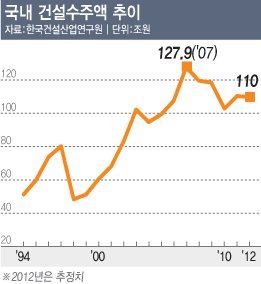 허 연구위원에 따르면 국내 건설 수주물량은 2007년 역대 최대인 127조9000억원을 기록한 이후 올해 110조원대(건산연 전망치)로 추락하는 등 감소세가 두드러지고 있다.