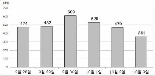 정부는 오는 28일부터 다음달 3일까지 6일간을 추석연휴 특별교통대책기간으로 정하고 관계기관 합동으로 특별교통대책을 마련했다고 19일 밝혔다. 올 추석은 주말과 겹쳐 귀성교통량이 29일 오전에 집중돼 혼잡이 예상되며 다음달 3일까지 징검다리 연휴로 귀경교통량은 분산될 것으로 조사됐다.