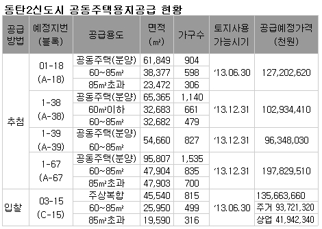 한국토지주택공사(LH)는 경기 화성 동탄2신도시 내 분양아파트 4406가구와 주상복합아파트 815가구를 건설할 수 있는 공동주택용지 5필지 32만3000㎡를 공급한다.