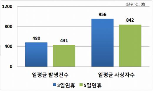 24일 교통안전공단이 2007년부터 5년간 추석 명절 교통사고를 분석한 결과 연휴기간 일평균 교통사고 발생건수는 3일 연휴 때 480건으로 5일 연휴(431건)보다 11.4%나 높았다. 일평균 사상자 수도 3일 연휴 때 956명으로 5일 연휴(842명)보다 13.5% 많았다.