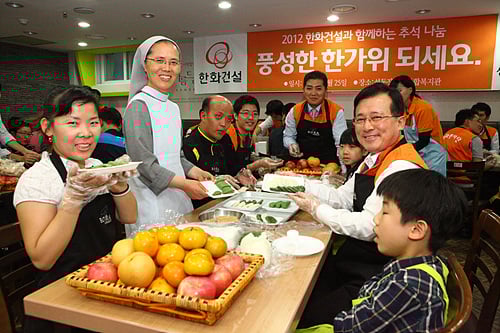 한화건설은 25일 서울 성동구 성동장애인 종합 복지관에서 이근포 사장을 비롯한 임직원 50명이 참석한 가운데 송편과 절편, 추석음식을 복지관 관원과 함께 만들고 인근지역 소외계층 100여 가구에 전달했다고 밝혔다.