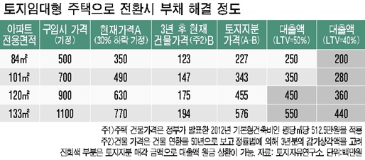 현실성 점검을 위한 시뮬레이션 결과도 양호하다는 의견이다. 전용면적 133㎡, 120㎡ 아파트는 토지를 매각한 대금으로 LTV(담보인정비율) 50% 이하로 빌렸을 경우 대출금의 원금을 모두 상환하고 남았다. 상대적으로 토지 지분이 작은 101㎡와 84㎡는 LTV를 40%로 대출했을 때만 원금을 갚을 수 있는 것으로 조사됐다.