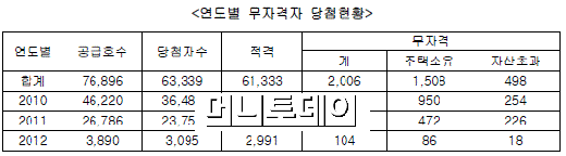 임대주택의 무자격 당첨 문제도 지적됐다. 2010년 이후 3년간 임대주택은 7만6800여가구 공급된 가운데 무자격 당첨자는 전체의 2.6% 수준인 2006건이었다. 임대주택 외 집을 소유한 경우가 1508건, 자산초과가 498건으로 나타났다.
