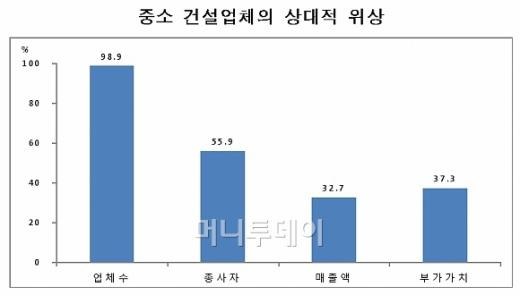 반면 대형 건설사의 평균 매출액은 같은 기간 1669억원에서 5568억원으로 3.3배 증가해 대기업과 중소업체간 양극화가 심화된 것으로 나타났다. 이에 따라 중소 건설업체들이 최근 5년 동안 건설시장에서 차지하는 비중도 4.7%포인트 감소했다.