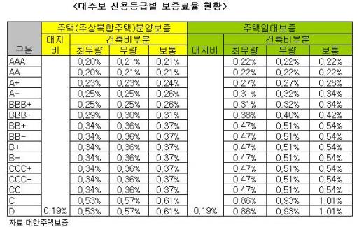 특히 서민주택임대의 보증요율은 일반분양요율에 비해 6~7% 더 높다고 지적했다. AAA등급 최우량사업자의 건축비 분양보증요율은 0.204%이지만 임대주택 보증요율은 0.218%로 0.014%(6.9%) 더 높다는 것이다. AAA등급 우량사업자도 일반분양보증요율은 0.206이지만 주택임대보증요율은 0.221%로 0.015%(7.3%) 더 높다.