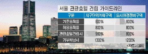 24일 서울시에 따르면 시 도시계획국은 지난 7월부터 시행중인 특별법과 관련, 이달 8일 이같은 내용을 골자로 한 '관광숙박시설 용적률에 관한 특례 운영기준'(이하 가이드라인)을 마련, 시행에 들어갔다.