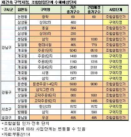 이번 법 개정안 통과로 당장 재건축 단지들이 몰려있는 강남3구와 강동구 등이 최대 수혜지역으로 꼽힌다. 수혜대상은 현재 사업시행인가를 받은 단지와 조합설립이 마무리돼 사업속도를 높일 경우 수혜을 받을 수도 있는 단지다.