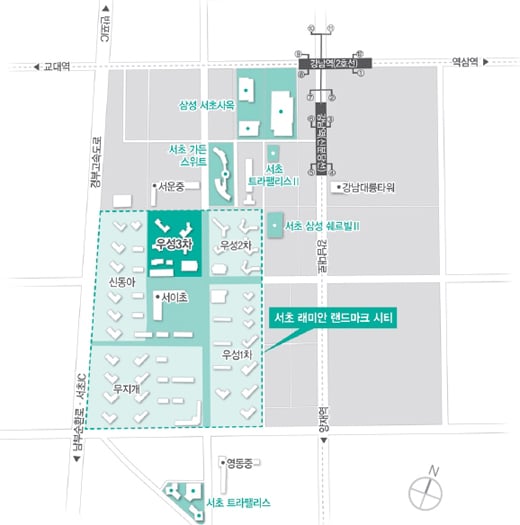 특히 삼성물산은 우성3차를 포함해 이 일대에 '래미안 타운'을 형성하겠다는 공약을 내걸었다. 강남구의 기본 도시 형태인 격자형 도시구조 내에 있고 교통 인프라와 교육 환경이 우수해 타운화로 형성될 경우 대규모 랜드 마크 단지가 될 가능성이 높다는 점을 집중적으로 부각시킨 것.