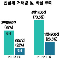 16일 국토해양부의 아파트 전·월세 거래량 자료에 따르면 2011년 1월 전세 거래량은 78%(2만8930건), 월세는 22%(7957건)였으나 지난해 11월 전세는 73.5%(4만1400건)로 4.5%포인트 하락하고 월세는 26.5%(1만4900건)로 4.5%포인트 상승했다.
