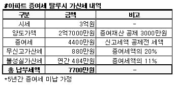 하지만 적발될 경우 세금폭탄을 피할 수 없다. 3억원짜리 신혼집을 부모에게 받았으나 5년간 신고를 안했다가 적발될 경우 4400만원의 증여세와 가산세 880만원이 기본적으로 부과되고 불성실가산세가 연간 484만원씩 5년간 총 2420만원이 합산돼 총 7700만원의 세금폭탄을 맞는다.
