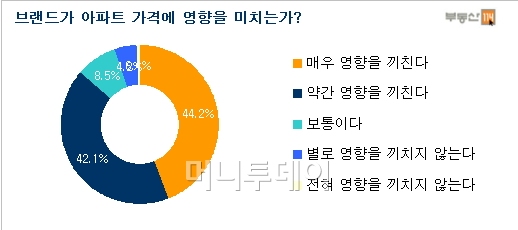 '브랜드가 아파트 가격에 영향을 미치는가'에 대한 질문에는 응답자의 86.3%(638명)가 '영향있다'고 답했다. 하지만 아파트를 구입할 때 특정브랜드 선택의향에 대한 조사에서는 '그렇다'고 답한 응답자가 10명 중 6명으로 낮아졌다. 2011년 조사에서는 10명 중 7명이었다.
