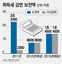 이처럼 부동산 취득세 감면 보전액이 밀려 있는 것은 서울시뿐이 아니다. 행안부에 따르면 정부는 2011년 2조3300억원의 보전액 중 2360억원을 미지급한 상태다. 지난해 보전액은 8000여억원, 올해 보전액은 1조4500억원에 달할 것이라고 행안부는 추정했다.