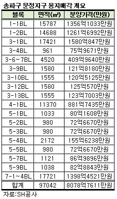 앞서 서울시는 지난해 문정지구 토지 매각이 난항을 겪자 기존 미래형 업무용지 8개 용지를 획지 구분선을 기준으로 32개로 쪼개, 이중 11개를 팔았다. SH공사가 지난해 문정지구 미래형 업무용지를 팔아 거둬들인 수익은 총 4560억원. SH공사는 나머지 21개 용지 중 사전 입찰의향조사를 토대로 몇개 필지를 합쳐 이번에 다시 18개 용지로 매각에 착수했다.