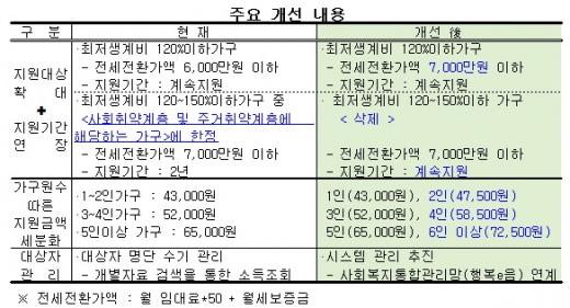 우선 지원대상이 최저생계비 150% 이하로 확대된다. 기존에는 최저생계비 120%이하이거나 최저생계비 120~150%이하가구 중 국민기초생활수급자를 제외한 사회취약계층과 주거취약계층 가구로만 한정해 지원해왔다.