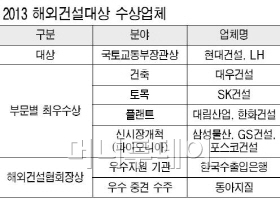 올 행사에서 영예의 대상인 국토부교통부장관상은 현대건설과 한국토지주택공사(LH) 등 2개 기업이 수상했다. 현대건설은 지난 한해 베네수엘라 정유공장 증설공사(14억900만달러)를 비롯해 우루과이 복합화력발전(5억달러)과 콜롬비아 하수처리장 공사(3억5000만달러) 등 모두 23억달러에 가까운 공사를 잇따라 수주하면서 신시장인 중남미에서 눈부신 수주성과를 보였다는 평가를 받는다.