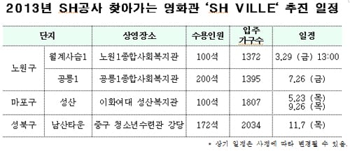 SH공사는 오는 29일 노원구 월계3동 월계사슴1단지 아파트 내 노원1종합상회복지관에서 처음으로 영화 상영을 시작하고 마포구와 성북구등에서 올해 총 5회에 걸쳐 행사를 진행하겠다고 설명했다.