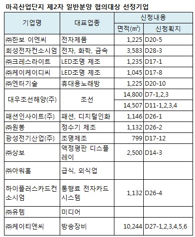 서울시는 마곡산업단지 2차 일반분양 신청기업에 대해 지난달 30일 정책심의위원회를 심의한 결과 대우조선해양, 희성전자, 아워홈 등 대기업 3개사와 케이티엔씨 등 중소기업 11개사 등 총 14개 기업을 협의대상자로 선정했다고 2일 밝혔다.
