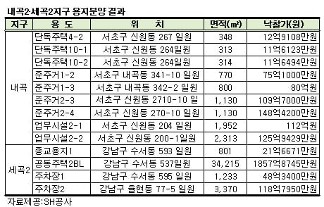 관심을 끌었던 세곡2지구 공동주택 용지 2블록은 한국자산신탁이 1857억8745만원에 낙찰받았다. 내곡지구 준주거 용지의 경우엔 예정가보다 평균 230% 높은 수준에 낙찰가가 결정됐다.