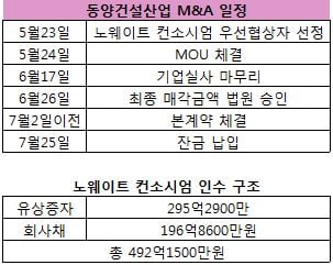 노웨이트 컨소시엄은 다음달 2일 전까지 본계약을 체결하고 다음달 25일까지 계약금(51억원)을 제외한 잔금 441억1500만원을 납부할 예정이다. 노웨이트 컨소시엄은 동양건설산업이 발행할 2년 만기 회사채(196억8600만원)와 신주(295억2900만원)를 매입하는 형태로 인수대금을 납부하게 된다.
