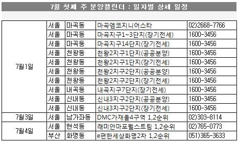 청약일정은 1순위는 7월1일부터 3일간, 2순위와 3순위는 각각 4일, 5일에 시작한다. SH공사는 1일부터 천왕1·2지구와 신내3지구에 공공분양 2309가구를 함께 분양한다. 마곡지구에 첫 공급되는 아파트여서 실수요자의 관심을 끌 것으로 보인다.