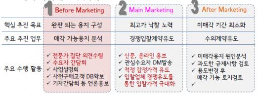 기존 공급자 위주의 공급 방식도 바꿨다. 그동안 수요에 맞지 않는 용도로 입찰공고를 지속해봐야 제대로 된 주인을 찾지 못하는 상황이 반복됐지만 수요자들이 원하는 용도를 찾아내 토지이용계획을 바꿔주는 등 수요자 중심의 마케팅 전략을 구사하기 시작하자 상황은 달라졌다.