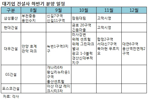 실제 23일 건설업계에 따르면현대건설(164,700원 ▲2,700 +1.67%),삼성물산,대우건설(10,140원 ▲90 +0.9%),GS건설(22,400원 ▼1,000 -4.27%), 포스코건설 등 대기업들의 하반기 분양 물량은 대부분 9~10월에 집중돼 있다. 이 기간중 신규공급 예정물량만 전국 46개 사업지에서 총 3만5000여가구에 달한다.