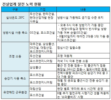 GS건설(27,400원 ▼800 -2.84%)은 빈사무실에 냉방시설이 켜져 있는지 확인하기 위해 수시로 현장사무실과 협력사 사무실을 순찰한다. 포스코건설은 이달 말까지 오전 10시~11시, 오후2시~5시에 냉방시설 사용을 절반으로 줄였다.