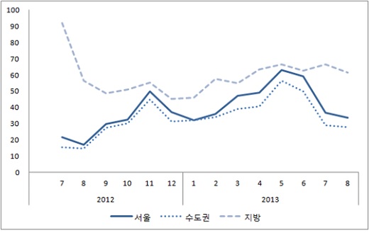 지난 7월 서울·수도권 주택사업환경지수 하락에 이어 8월 지방시장의 하락으로 주택시장 침체 분위기는 전국적으로 확산됐다는 게 주산연의 분석이다.