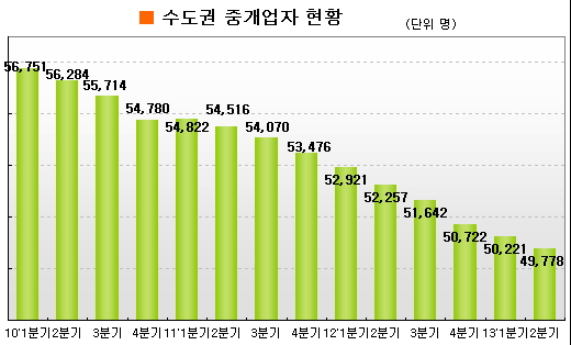 수도권 등록 중개업자수도 2008년 3분기 5만7007명으로 최대치를 기록한 후 △2010년 1분기 5만6751명 △2011년 1분기 5만4822명 △2012년 1분기 5만2921명 등으로 감소했다. 올 2분기 현재 4만9778명으로 7년 만에 5만명 이하로 내려갔다.