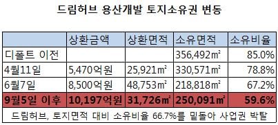 하지만 이번 토지대금 상환으로 드림허브의 토지소유 비율은 59.6%로 떨어져 사업시행자 지위를 상실했다는 게 구역해제 이유다. 구역해제는 이달 12일 시보에 게재되는 동시에 효력이 발생한다.
