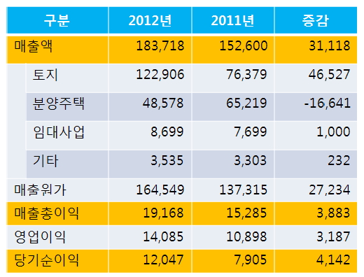 매출액은 분양주택 부분에서 지난해 반기보다 595억원 늘어났으며 부동산경기 침체에도 매출총이익률이 8%대로 양호한 실적을 기록했다. 앞으로 보유자산 매각 등 재무개선을 통해 연말기준 판매실적도 전년 실적을 상회할 것으로 예상된다고 LH는 밝혔다.