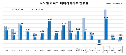 0.10% 가량 상승한 지방에선 정부종합청사 2단계 이전을 앞둔 세종시 인근지역의 오름세가 두드러졌다. 시도별로는 경북(0.26%) 대구(0.23%) 세종(0.18%) 충북(0.11%) 충남(0.10%) 부산(0.10%) 광주(0.08%) 등이 상승한 반면 전남(-0.04%)은 하락했다.