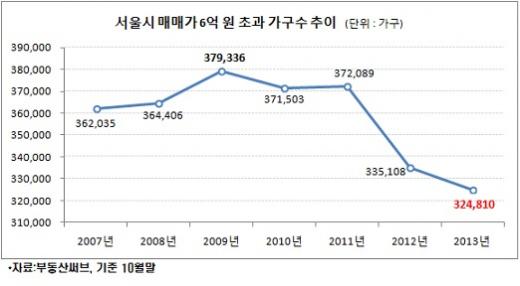 미국발 금융위기에 따른 부동산시장 장기침체로 서울시내 6억원 이상 고가아파트수가 2007년 이후 최저치로 감소했다.