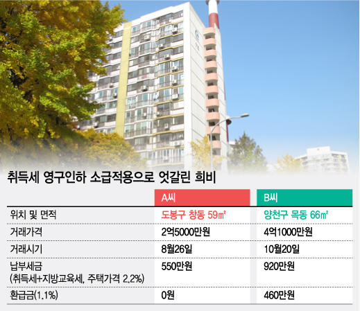 지난 10월 말 양천구 목동 6단지 47㎡의 잔금을 납부했다는 한 수요자는 "취득세와 지방교육세를 포함해 920만원의 세금 중 절반인 460만원을 돌려받게 됐다"며 "환급 가능성을 알긴 했지만 시기를 놓칠 것 같아 계약했는데 실제 환급받게 되니 공돈이 생긴 기분"이라고 말했다.
