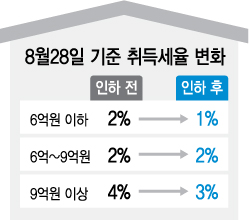 이번 취득세 영구인하 조치로 6억원 이하는 2%에서 1%로, 9억원 초과는 4%에서 3%로 취득세가 각각 줄어든다. 다만 6억원 초과~9억원 이하의 경우 현 2%가 그대로 유지된다.