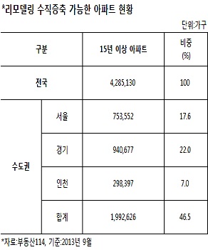 부동산114에 따르면 9월말 현재 전국 아파트 가운데 경과연수가 15년이 지나 리모델링 수직증축이 가능한 곳은 총 428만5130가구에 달한다. 이중 46.5%인 199만2626가구는 서울, 경기, 인천 등 수도권에 집중돼 있다.