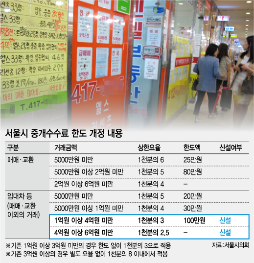 1억~4억원 미만의 경우 기존에 없던 한도액을 100만원으로 제한하는 내용도 신설된다. 따라서 이 구간에선 거래된 전세거래 금액의 0.3%와 100만원 중 낮은 금액이 중개수수료로 결정된다.