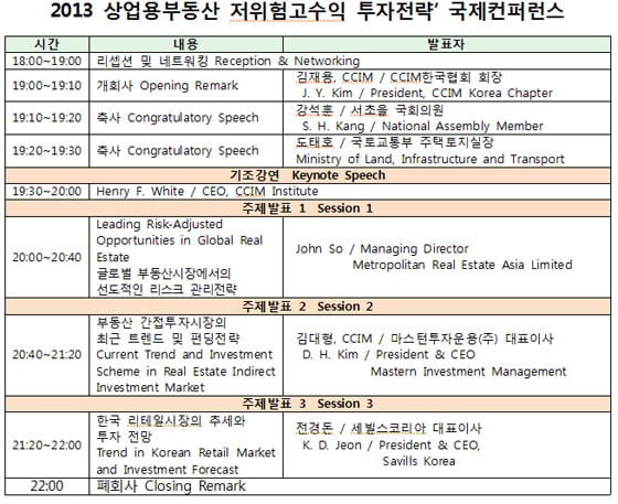 컨퍼런스는 각 섹션별로 △미국 메트로폴리탄부동산투자회사 홍콩현지법인 존소 상무(글로벌 상업용부동산시장 투자전망과 리스크 관리전략) △마스턴투자운용 김대형 대표(부동산간접투자의 트렌드와 펀딩전략) △영국 글로벌 부동산서비스회사 한국법인 세빌스코리아 전경돈 대표(국내 리테일 투자 전망) 등이 진행한다.