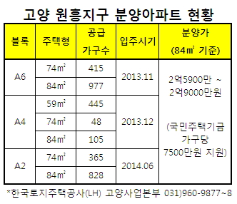 한국토지주택공사(LH, 사장 이재영)는 고양 원흥지구내 A2·A4·A6 등 3개블록이 이달부터 내년 6월까지 잇따라 입주한다고 18일 밝혔다. 이들 블록 공급물량은 전용면적 59~84㎡ 3183가구로, 분양가는 주변 시세보다 저렴한 3.3㎡당 평균 845만원 선이다.