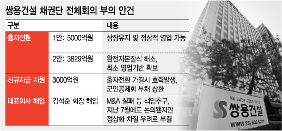 우리은행은 추가 자금지원과 함께 김석준 쌍용건설 회장의 해임안건도 채권단 전체 회의에 올렸다. 표면적으론 정상화 차질과 M&A 실패에 대한 책임추궁이지만 추가 자금지원에 반대하는 채권단을 달래기 위한 명분이라는 게 업계의 공통된 시각이다.