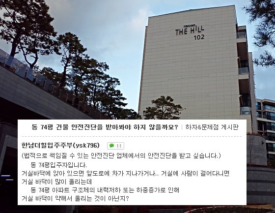 지난 여름 '신중하자'라는 아이디로 글을 올린 입주민은 "신문지상에는 '한남더힐'을 럭셔리주택이라고 홍보하던데, 방수공사를 했다는데도 시정이 안되니 구조적인 문제같다"며 "117동 3호라인 지하주차장 입구를 가보면 물난리 그 자체"라고 지적했다.