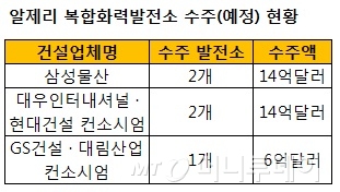 7일 해외건설협회에 따르면삼성물산과대우인터내셔널(81,300원 0%)·현대건설(171,400원 ▼1,600 -0.92%)컨소시엄,GS건설(40,750원 0%)·대림산업(67,300원 ▼1,300 -1.9%)컨소시엄은 각각 알제리의 전력청(SONELGAZ)이 발주한 메가 복합화력 발전소 프로젝트 입찰에서 구랍 18일에 각기 종합설계시공(EPC) 업체 우선협상대상자로 선정돼 계약을 앞두고 있다.