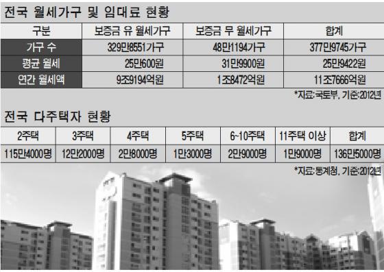 하지만 월세소득과 관련해 실제 과세대상이 몇 명인지는 알 수 없다. 정부가 월세를 놓는 다주택자를 공식적으로 집계하지 않아서다. 다만 통계청에 따르면 2012년 기준 국내 2주택 이상 보유자, 즉 잠재적 과세대상자는 136만5000명에 달한다.