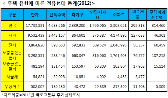 국토부 관계자는 "오피스텔은 아직 주택으로 통계가 잡히지 않기 때문에 따로 작성하지 않는다"며 "최근 주거용 오피스텔도 주택으로 보는 경향이 있어 올 하반기엔 거주용오피스텔에 대해 따로 통계를 작성하려고 준비중"이라고 말했다.
