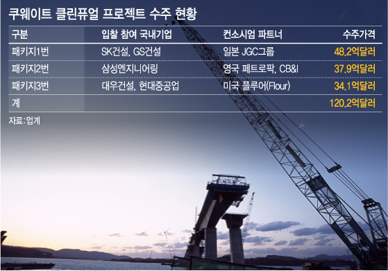 12일 건설업계에 따르면 쿠웨이트 CFP에 입찰서를 제출한 컨소시엄 가운데 GS건설, SK건설, 삼성엔지니어링,대우건설(33,200원 ▲400 +1.22%),현대중공업(479,000원 ▲3,000 +0.63%)등이 참여한 3개 컨소시엄이 3개 패키지에서 전날 LOA(Letter of Agreement)를 받았다.