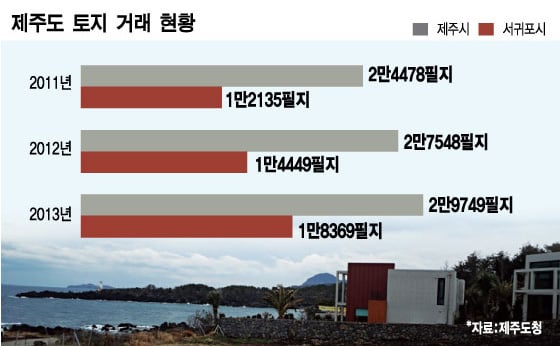 19일 국토교통부에 따르면 지난해 12월 한달간 제주도 지가상승률은 전월 대비 0.34%로, 전국 17개 시·도 가운데 세종시에 이어 2위를 기록했다. 2013년 한해 제주도 내 토지거래는 4만8118필지로 전년(4만1997필지)보다 15%가량 증가했다. 2011년(3만6613필지)에 비해선 31% 이상 급증했다.