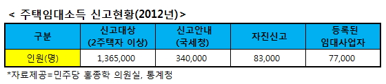 지난해 국정감사에서 홍종학 민주당 의원이 국세청으로부터 제출받은 자료에 따르면 2012년 기준으로 주택임대소득을 올렸을 것으로 추산한 9억원 이상 고가주택 보유자와 2주택 이상 보유자들을 대상으로 주택임대소득 신고안내를 한 인원은 34만여명이었다.