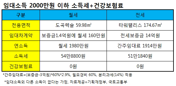 임대소득을 금융소득으로 간주할 경우 다른 소득없이 주택 2채를 보유하고 이중 1채를 14억4942만원에 전세를 주더라도 간주임대료 2000만원 이하에 해당, 건보료를 내지 않아도 된다. 월세의 경우엔 매달 166만6000원을 받고 있는 경우에 해당된다.